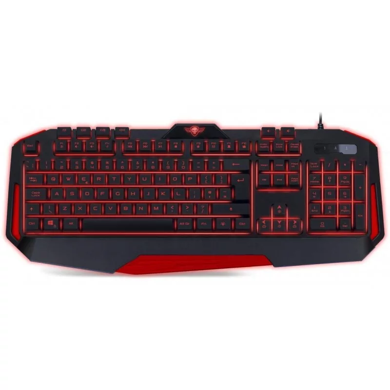 Ensemble Gaming: Clavier + Souris + Tapis + Casque-micro – Rétro-éclairage rouge – Clavier AZERTY – 105 Touches + 12 raccourcis Multimédia – Anti-Ghosting 26 touches – 4 touches gaming programmables – Interface USB – Câble 1.6m – Souris 7 boutons et molette de défilement programmables – Résolution 3200dpi – Casque circumaural – Câble 2.2m – Tapis dimensions: 225 x 190 x 3 mm – Garantie 1 an