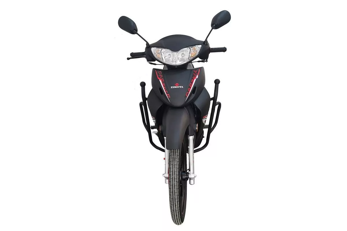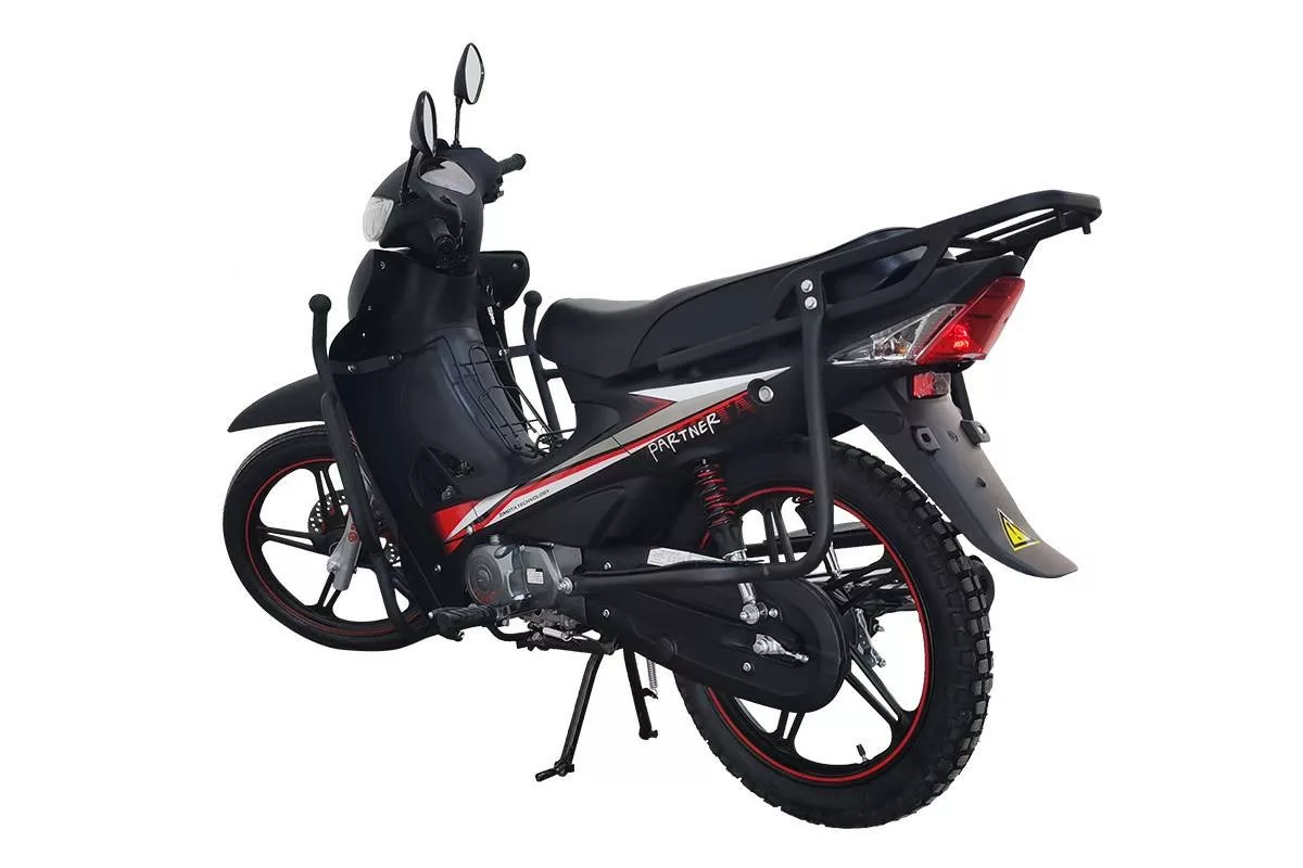 Motocycle Zimota Partner – Cylindrée: 110cc – Moteur : monocylindre 4 temps – Refroidissement : A air – Capacité Du Réservoir : 3,6L – couple maxi: 7.00/5.500 – Freinage: Avant/Arrière: Mono disque, ∅ 217 / Tambour, ∅ 110 – Capacité du réservoir: 3.6L – Pneu: Avant/Arrière: 2.50-17 / 2.75-17 – Suspensions: Avant/Arrière: Hydraulique/Ressort – Batterie: YB 5 LB – Dimensions: 1950 x 700 x 1100 mm – Poids: 96kg – Couleur : Rouge et Noir